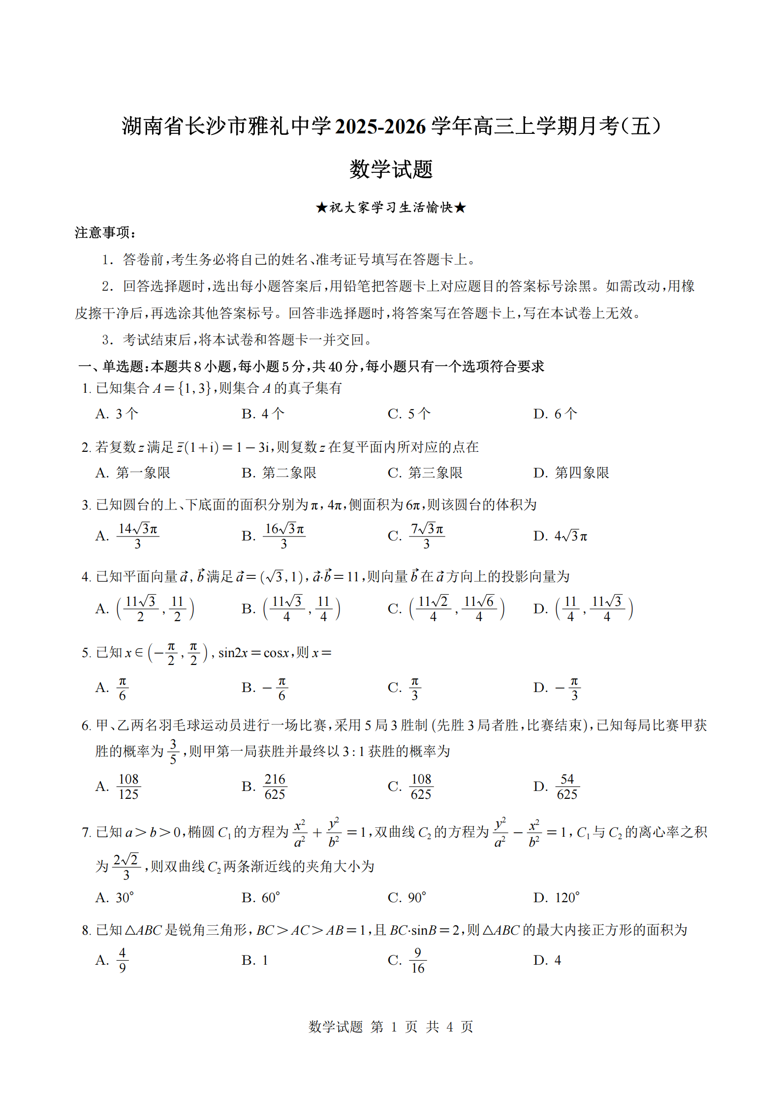 14 Jan 2026 1 min read 湖南省长沙市雅礼中学2025-2026学年高三上学期月考(五)数学试题与解析 (学生版)湖南省长沙市雅礼中学2025-2026学年高三上学期月考(五)数学试题与解析(学生版)湖南省长沙市雅礼中学2025-2026学年高三上学期月考(五)数学试题与解析.pdf3 MBdownload-circle