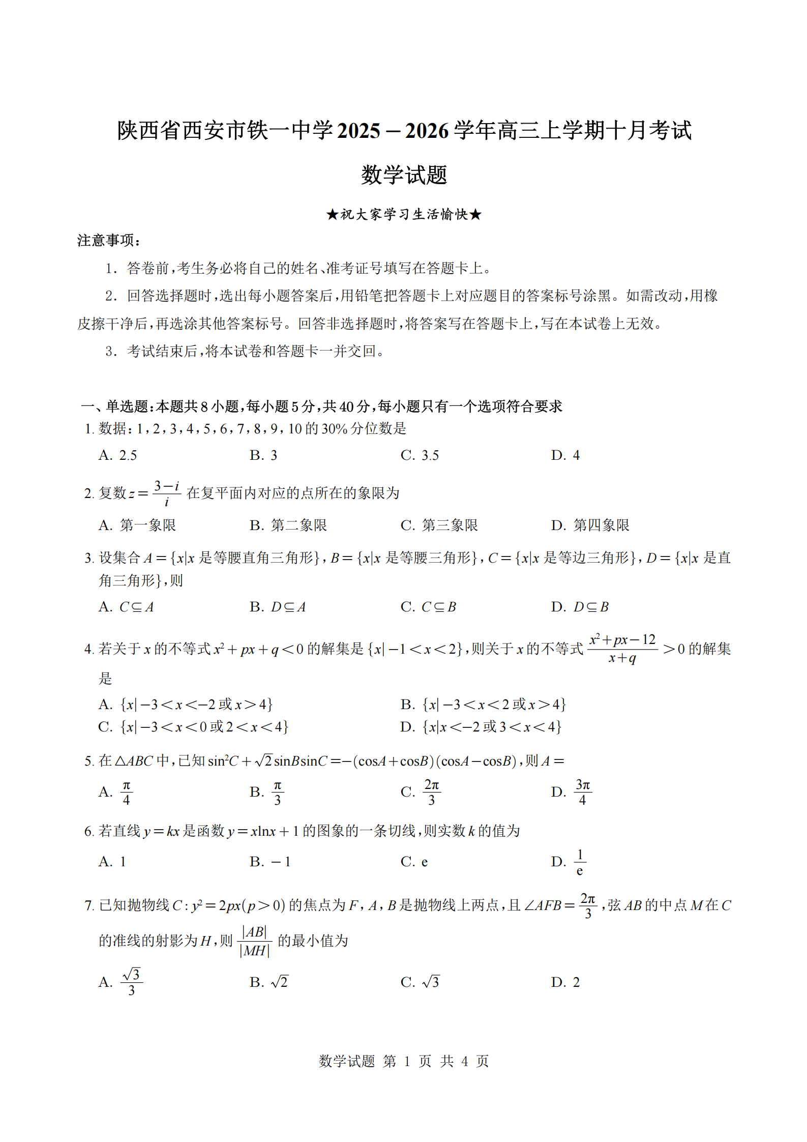 14 Jan 2026 1 min read 陕西省西安市铁一中学2025-2026学年高三上学期十月考试数学试题与解析 (学生版)陕西省西安市铁一中学2025-2026学年高三上学期十月考试数学试题与解析(学生版)陕西省西安市铁一中学2025-2026学年高三上学期十月考试数学试题与解析.pdf2 MBdownload-circle